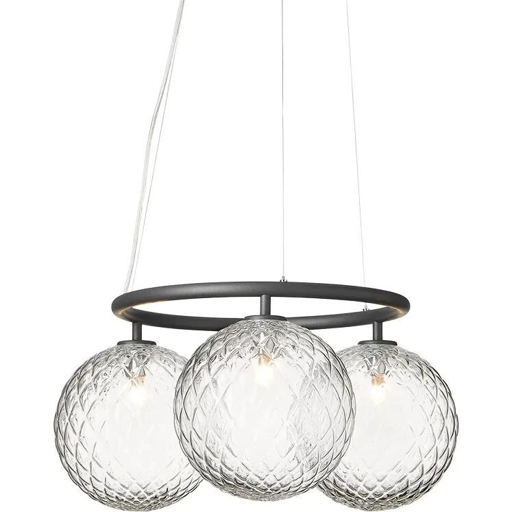 Chandelier by Vintersol with a modern, minimalistic design with a Nordic expression. It has a smooth halo in metal with three round lampshades in mouth Breath glass perfect Ascend the dining table or the sofa table.