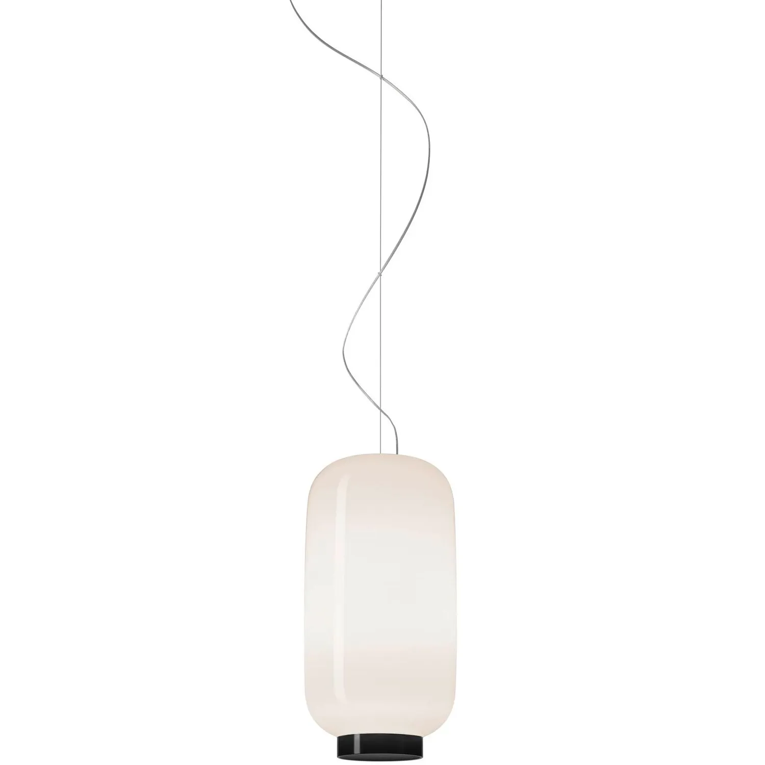 The pendant by Ferruci has a stylish, white design in mouth Breath glass with a rounded shape and a black collar at the bottom to provide a direct downward light. The lamp is beautiful by itself, in a row or as a cluster in different sizes, which creates a cool effect.