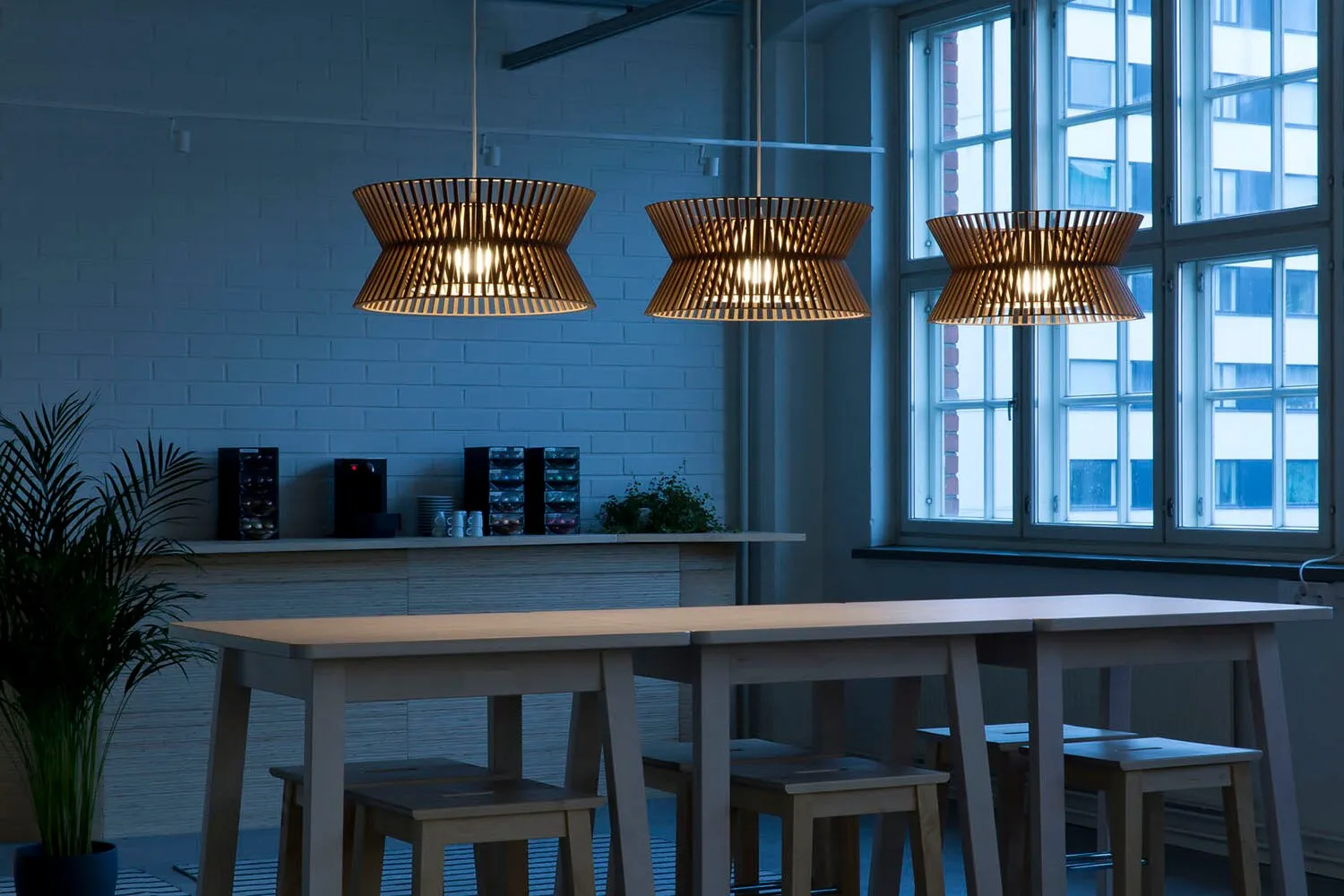 Effectieve plafondlamp in elegant ontwerp, handgemaakt van voorgevormde berkenhouten schijfjes in Finland. Het hout geeft die aangename uitdrukking en heerlijke sfeer. Inclusief 150 cm textielkabel.