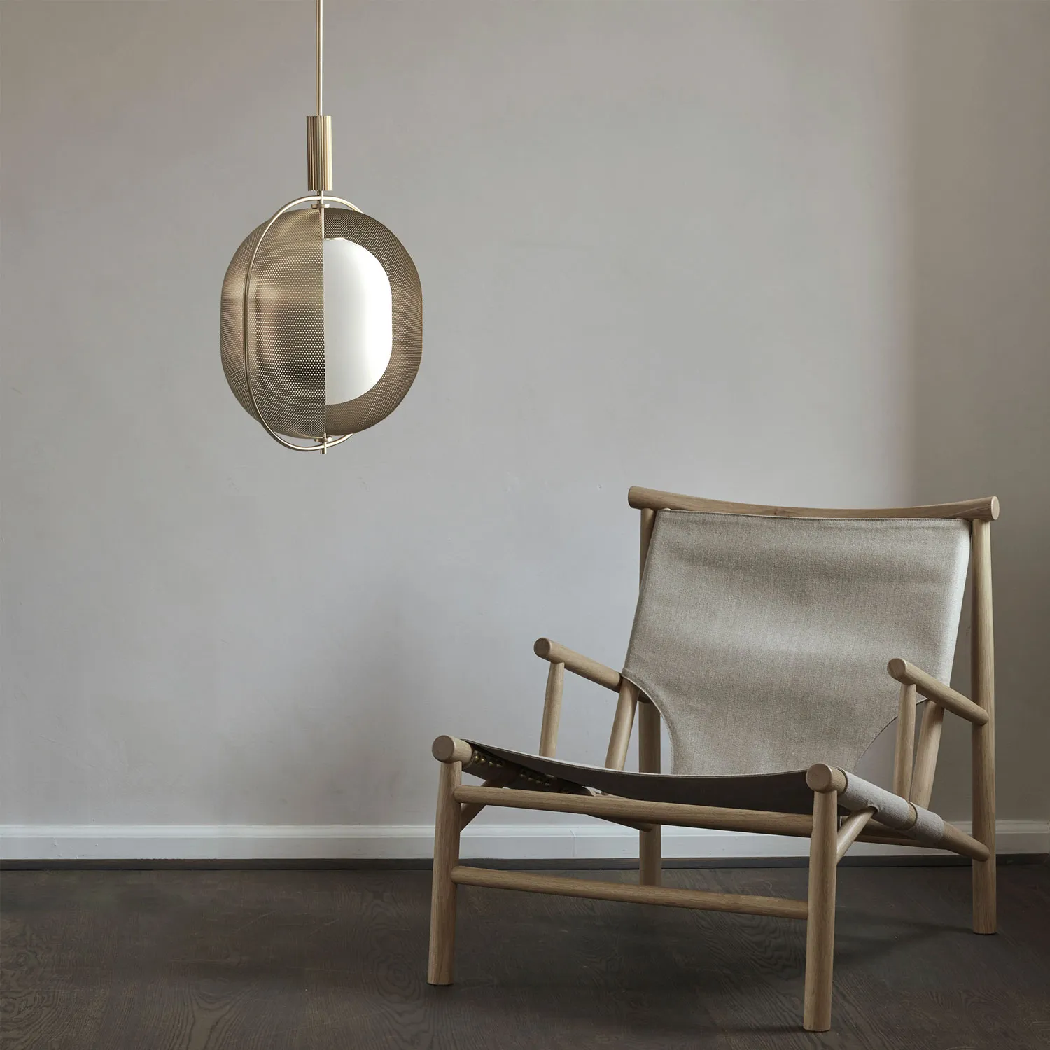 Pendant by Frisk Form with an eye catching design in iron with Japanese inspiration and a light source in opal glass. It has an adjustable, perforated shade with a unique, dimmable light perfect for the modern home.