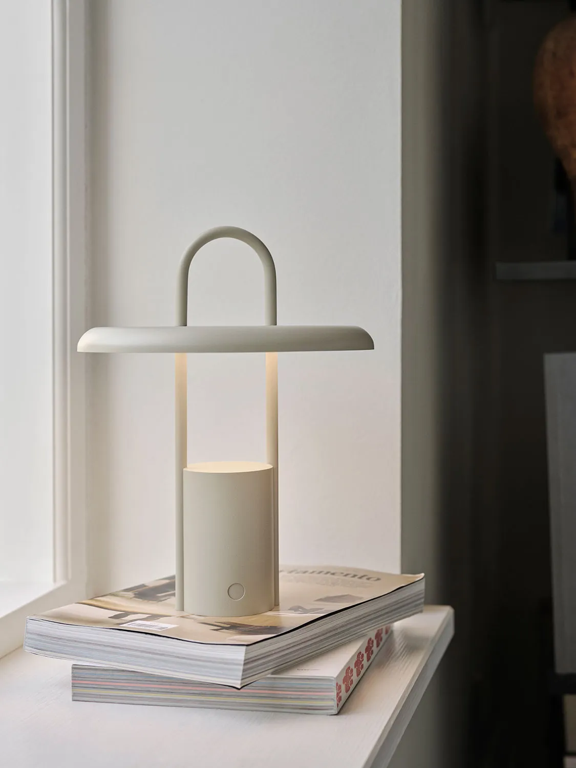 The LED lamp by Livingston has modern, stripped design in iron with practical three-step dimmer to provide a warm and atmospheric light. It has barrel-shaped base with flat lampshade with practical handle at the top to easily move around at home. It has high-quality Charm for everyday use. Choose between different colours.